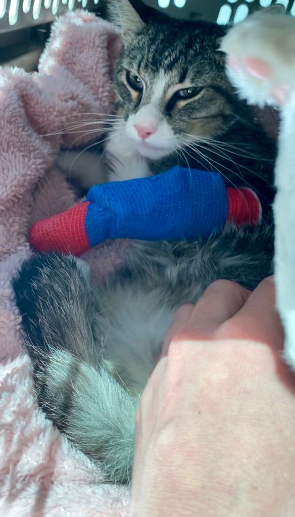 When I pulled up to the ER, I called to let them know I was there. I began loving on him. He became responsive for the first time since morning. The nurse came out to get him but I asked if I could have 5 minutes with him. He said yes and was happy to know he was doing better. He began kneading with his one available paw, (the other wrapped in gauze) slowly rolled over on his back, and lifted his back leg up for a belly rub. More peace came over me.